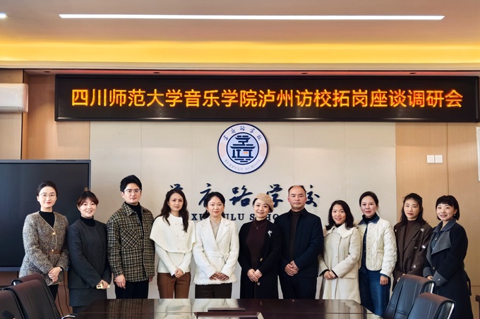 为精准对接地方教育人才需求,持续优化人才培养体系,促进2026届毕业生高质量就业,11月25日,四川师范大学音乐学院党委副书记谢琳、副院长李松兰带队,学生工作办公室主任罗毅、学院就业专员王艺霖、毕业班辅导员代表纪佳旭一行赴泸州市龙马高中学府路学校,与泸州市教育科学研究所音乐教研员祝云、龙马潭区音乐教研员刘姝,及龙马潭区小街子小学党总支书记陈婷、鱼塘学校党总支书记许璐、龙马高中学府路学校副校长熊贵莲、泸州师范附属小学副校长甘玉穗、力行路小学副校长杨青、梓潼城西学校德育副主任刘茂秋,合江县中学校德育室主任李国辉等多所中小学负责人开展就业合作座谈与交流活动,围绕人才培养、岗位需求、实习基地共建等核心议题深入研讨,成功搭建校地人才供需对接新桥梁。