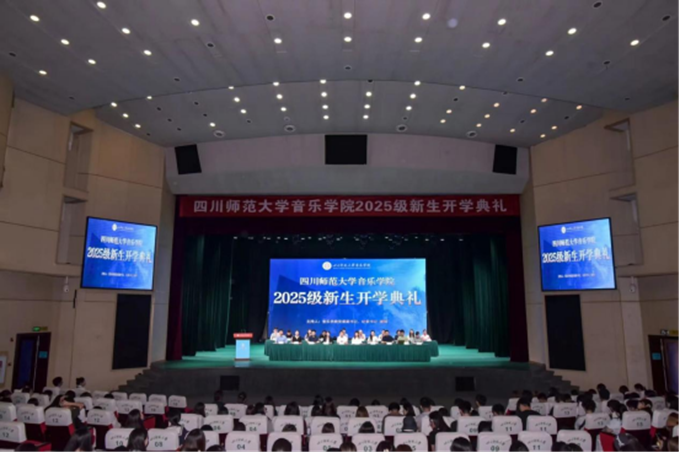 四川师范大学音乐学院2025级新生开学典礼于 9月13日9时在成龙校区龙湖剧场举行。学院党委书记曹欣、院长李亚梅、副院长李松兰、汪浩,各部门主任、教研室主任及教师、校友、在校生代表与全体新生参会,李亚梅院长致欢迎辞并对学院各方面情况进行了介绍。教师代表缪礼云、校友代表李忠尧、在校生代表李露丹分别分享感悟。曹欣书记最后对全体2025级新生进行了勉励,提出了期望。