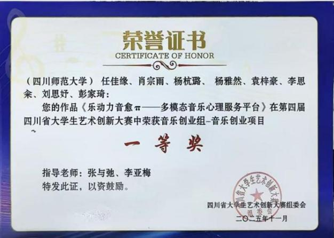 项目《乐动力音愈π一多模态音乐心理服务平台》获得大赛音乐创业组-音乐创业项目一等奖,并于11月2日受邀至四川音乐学院参加颁奖典礼暨优秀作品展示。