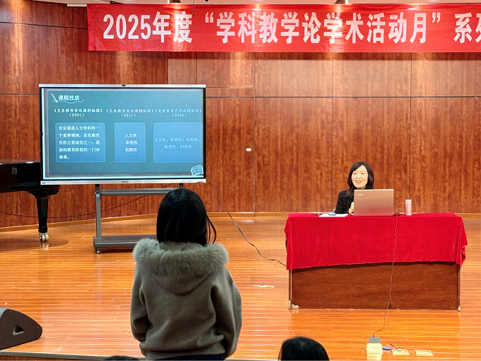 2025年12月10日下午,四川师范大学音乐学院2025年度“学科教学论学术活动月”系列活动第二场在伯牙音乐厅举行。学院学科教学论教研室刘亚男副教授作了题为《大美育与新课标、新教材、新科技背景下音乐课堂的重构》的学术讲座。学科教学论教研室教师和音乐学22级和24级学生参加了本次讲座。